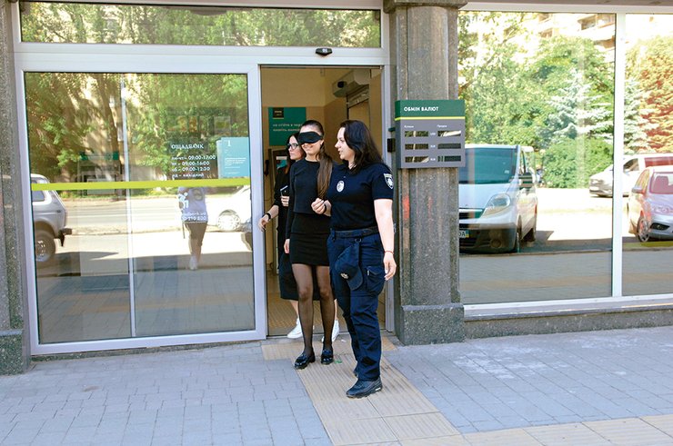 В Виннице есть необычная остановка. Выйдя на ней, ощущаешь под ногами плитку с рельефными линиями и точками. Подобная дорожка — не прихоть дизайнера. Тактильные маркеры на ней обозначают безопасный маршрут для людей с нарушениями зрения, которые для ориентации в пространстве пользуются белой тростью. Эта дорожка ведет к дверям инклюзивного отделения Ощадбанка. Для клиентов, которые пользуются колясками или которым трудно подниматься по ступенькам, здесь оборудован пологий пандус. Перед заездом на него расположена кнопка вызова менеджера. Через несколько секунд после нажатия на нее из дверей отделения выходит приветливая девушка — сотрудник банка. Однако вместо клиента на коляске она видит корреспондента Фокуса, желающего на личном опыте проверить, как инклюзивные банковские отделения работают в Виннице.