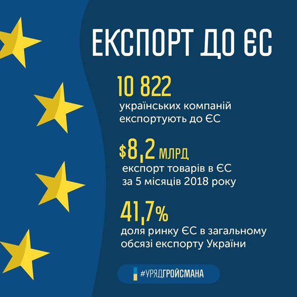 В приведенной премьером инфографике указывается, что объем экспорта украинских товаров в ЕС за первые 5 месяцев текущего 2081 года равен $8,2 млрд, а доля рынка Евросоюза в общей структуре экспорта из Украины составляет 41,7%.