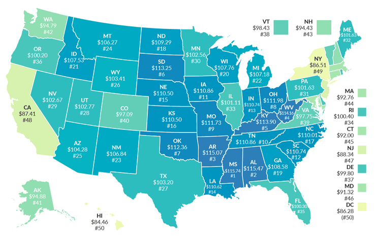 $ 100 стоят больше всего в Миссисипи ($115,74), в Алабаме ($115,47), в Арканзасе ($115,07), в Западной Вирджинии ($114,16) и в Кентукки ($113,90).