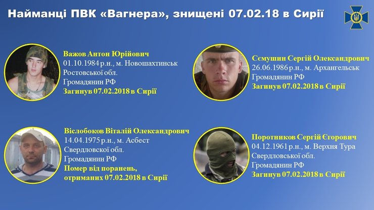 Всего по данным СБУ, в результате боестолкновения с американскими военными 7 февраля 2018 года погибли или умерли в последствии от полученных ран 58 наемников "Вагнера".