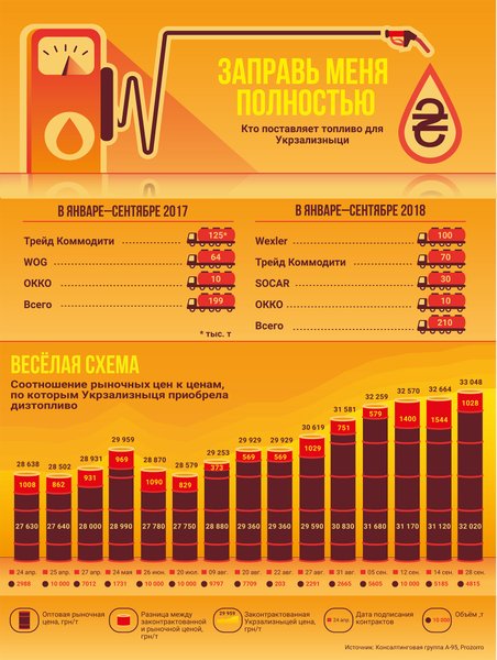 Всего, по подсчетам экспертов, на закупках дизельного топлива в 2017 году "Укрзализныця" потеряла более 160 млн грн. В УЗ соглашаются: махинации на приобретении топлива входили, вероятно, в топ-3 самых коррумпированных закупок в стране. За последние несколько лет компанию трясло от топливных скандалов, а при предыдущем руководстве УЗ несколько раз была на грани — топлива хватало меньше чем на сутки.