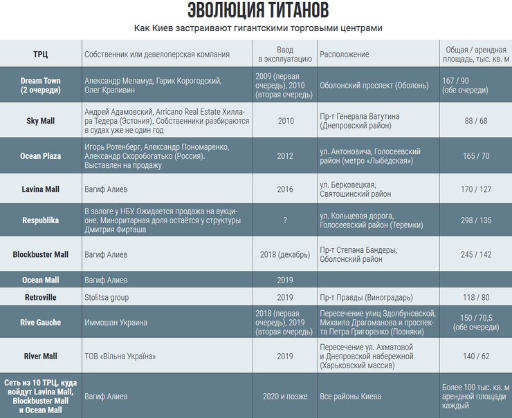 Наиболее близки к завершающей стадии строительства Blockbuster Mall и Ocean Mall, которые Алиев возводит на проспекте Степана Бандеры и на Лыбедской площади соответственно. "Ввод этих объектов в эксплуатацию задекларирован на конец 2018 года, но полноценное реалистичное открытие при должном финансировании возможно уже в 2019-м", — рассказал Фокусу Константин Олейник из UTG. По его информации, уже сейчас идет работа по заполнению торговых галерей этих ТРЦ арендаторами. В частности, в ТРЦ Ocean Mall должен открыться первый гипермаркет всемирно известной шведской сети IKEA в формате city store, а также магазин фешен-ретейлера H&M. Появление первой точки под этой вывеской в ТРЦ Lavina Mall в августе 2018 года сопровождалось небывалым ажиотажем.