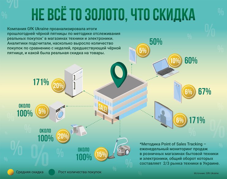 Причины стоять в длинных очередях в черную пятницу у покупателей из разных стран отличаются. В США преобладает идея подготовки к Рождеству, поэтому абсолютный хит продаж — игрушки. К примеру, в сети Target в прошлом году продавали 600 плюшевых мишек Тедди каждую минуту. Британцы подгадывают к черной пятнице обустройство дома: в хитах продаж в Туманном Альбионе — ковры и шторы. Общей тенденцией для этих стран, да и для Украины тоже, является электроника и бытовая техника. Американцы и британцы, как безумные, покупают телевизоры. Украинцы, как показывает исследование GfK Ukraine, больше всего "охотятся" за холодильниками и стиральными машинами, чуть меньше спрос на планшеты, смартфоны и ноутбуки. Это отлично иллюстрирует настроения украинских покупателей, которые рассматривают черную пятницу как возможность совершить большую запланированную покупку, даже если скидки не настолько высоки, как обещалось.