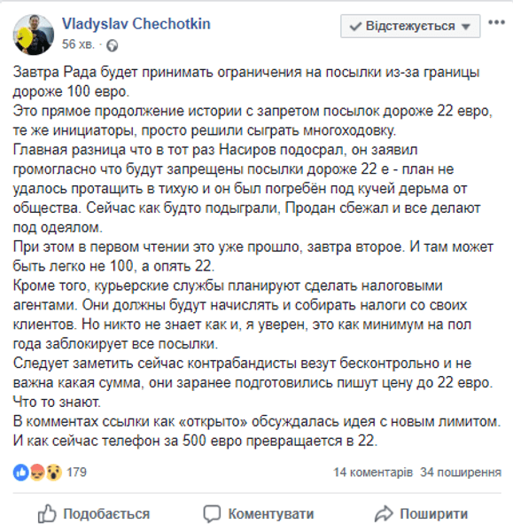 Экономика В Украине могут ввести очередные ограничения на посылки из заграницы 19.11.2018 в 07:24 0 Поделиться: поделиться в Facebook отправить в Telegram отправить в X отправить в Viber отправить в Whatsapp отправить в Messenger отправить в LinkedIn Фото: Retailers.ua Владислав Чечеткин уверен, что новый закон как минимум на полгода заблокирует все посылки Поделиться: отправить в Telegram поделиться в Facebook поделиться в X отправить в Viber отправить в Whatsapp отправить в Messenger отправить в LinkedIn Теги: контрабанда таможня налоги Rozetka.UA посылки Читайте нас в: Читайте в Telegram Читайте в Facebook Читайте в X Читайте в Google news Читайте в Viber Читайте в LinkedIn
