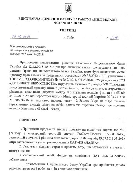 13 декабря на онлайн-площадке ProZorro.Продажи ФГВФЛ отменил решением Исполнительной дирекции (№3310 от 13 декабря 2018) аукцион, на котором были реализованы права требования по кредитам неплатежеспособного "КБ "Надра" Дмитрия Фирташа. Обеспечением по этим кредитам служил ТРЦ "Республика".