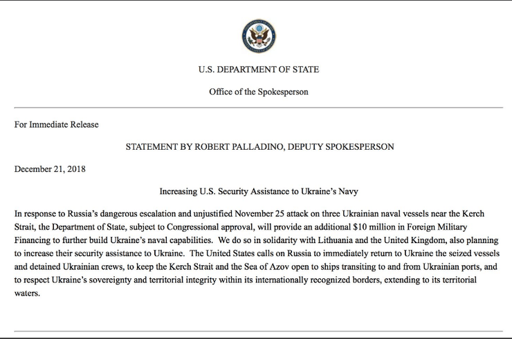 "В ответ на опасную эскалацию России и необоснованное нападение 25 ноября на три украинских военно-морских судна возле Керченского пролива Государственный департамент, при условии одобрения Конгрессом, выделит дополнительно 10 млн долларов для дальнейшего наращивания военно-морского потенциала Украины", - говорится в заявлении.
