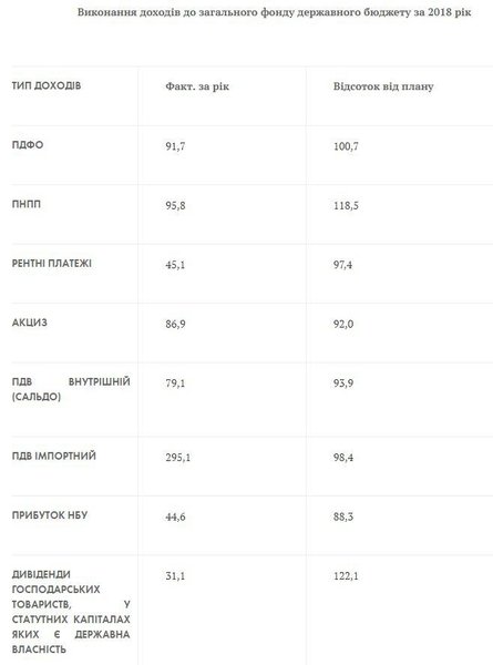 Также в 2018 году налог на прибыль предприятий составил 95,8 млрд, что на 18.5% больше плановых показателей. Налог на доходы физических лиц принес в госбюджет 91,7 млрд грн, акцизы – 86,9 млрд грн и рента 45,1 млрд грн.