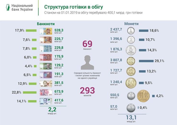 И этой суммы - 2,2 млрд гривен монет (13,1 млрд штук) и 397,8 млрд - банкноты (2,95 млрд штук).