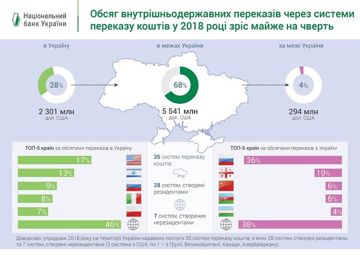 "Объем переводов внутри страны составил 150,530 млрд грн, или 5,541 млн долл. в эквиваленте, объем переводов в Украину - 2,301 млрд долл. в эквиваленте, за пределы Украины - 294 млн долл. в эквиваленте", - говорится в сообщении.