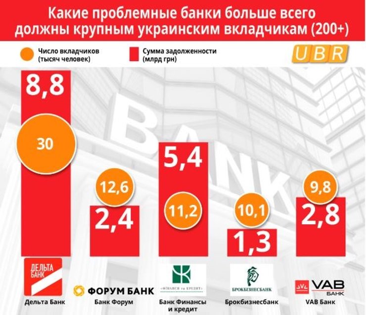 На данный момент больше всего пострадали вкладчики Дельта Банка, где за крупными компенсациями стоит в очереди сразу 30 тысяч человек. Им должны 8,8 миллиардов гривен.