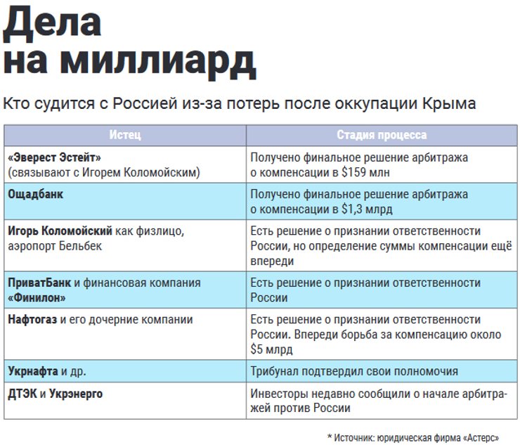 "Украинские компании и отдельные граждане (инвесторы) подали ряд исков против РФ в порядке международного инвестиционного арбитража касательно утраченных активов в Крыму, — обобщает Михаил Солдатенко, юрист юридической фирмы "Астерс". — Инвесторы просят присудить им компенсацию за инвестиции, которые отобрали так называемые крымские власти после оккупации полуострова на основании соглашения о поощрении и взаимной защите инвестиций между правительствами Украины и РФ". Этот документ запрещает экспроприацию имущества иностранного инвестора без компенсации, что, собственно, и произошло с крымскими активами украинских бизнесменов в нарушение положений соглашения.