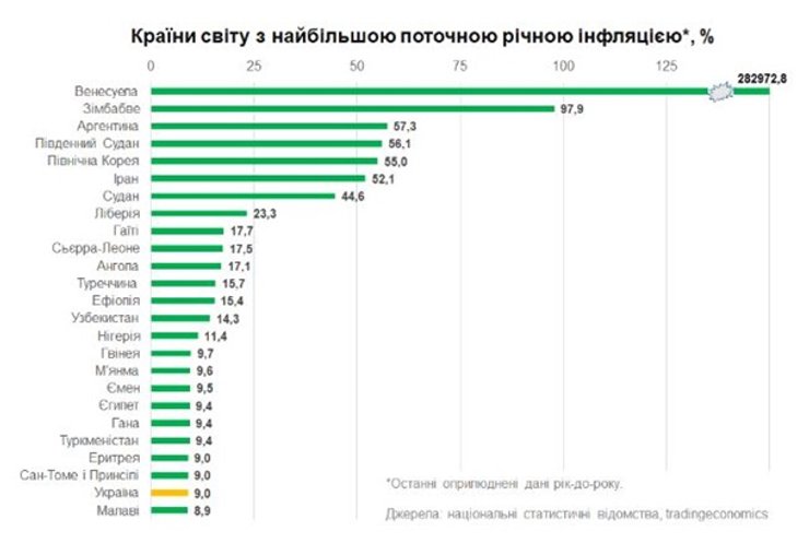 Отмечается, что с показателем годовой инфляции в 9% Украина делит 22-24-е место. При этом страна остается "лидером" по уровню инфляции в Европе.