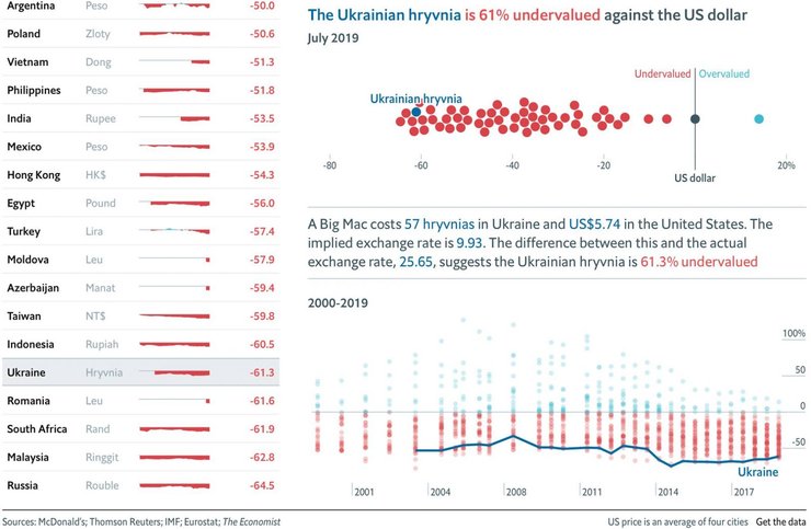 - Согласно январскому БигМак индексу украинская гривна была недооценена к доллару на 65,2%. Тогда гривна заняла предпоследнюю позицию в Индексе Биг-Мака.