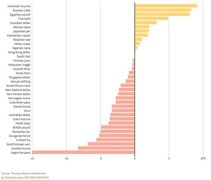 При этом самой девальвировавшей валютой стало аргентинское пессо, стоимость которого упала на 15% по отношению к доллару. Также заметно "просели" шведская крона (8,3%) и южнокорейская вона (6,9%).