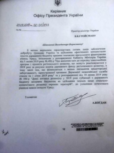 В частности, об этом заявил руководитель Львовского областного совета Александр Ганущин, который опубликовал копию письма за подписью руководителя Офиса президента Андрея Богдана, в котором тот просит приостановить расходы по распределению части субвенции на социально-экономическое развитие и ГФРР до формирования нового состава правительства.