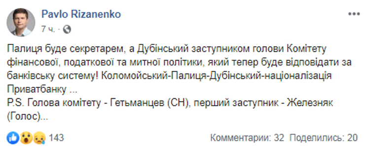 "Палица будет секретарем, а Дубинский заместителем председателя комитета финансовой, налоговой и таможенной политики, который теперь будет отвечать за банковскую систему!... P.S. Председатель комитета - Гетьманцев (СН), первый заместитель - Железняк (Голос) ..." - написал Ризаненко.