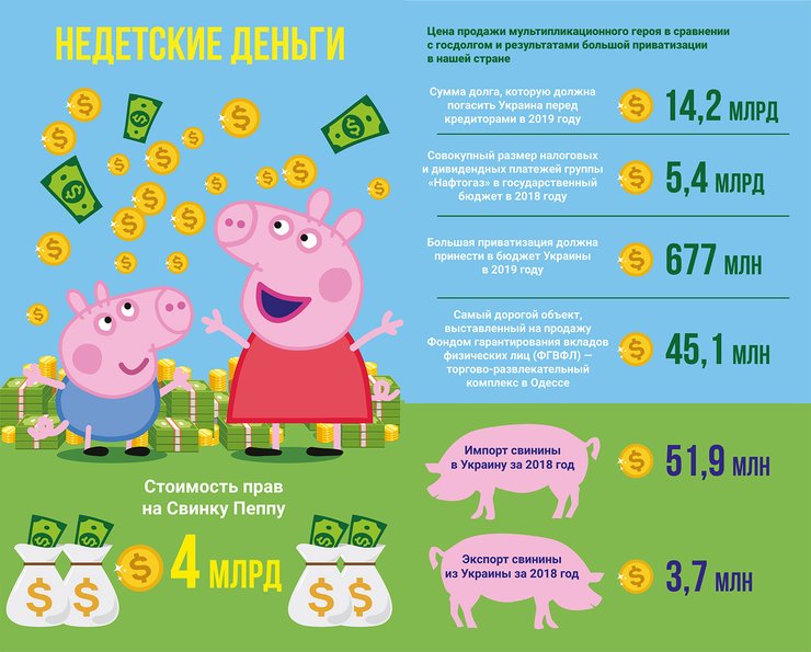 $4 млрд — это много или мало? Давайте разложим по полочкам. Чтобы прочувствовать масштаб цены, достаточно посмотреть на инфографику справа. Нарисованная свинка стоит дороже, чем суммарный объем экспорта и импорта свинины в 2018 году в нашей стране. Если данное сравнение несильно впечатляет, стоит подумать о том, что стоимость Пеппы — это полбюджета Албании или десятая часть бюджета Украины. А если сравнить цену Пеппы и капиталы самых богатых людей Украины, то получится, что Свинка — это пол-Ахметова (его состояние немного больше $8 млрд), четыре Фирташа или почти пять Порошенко.