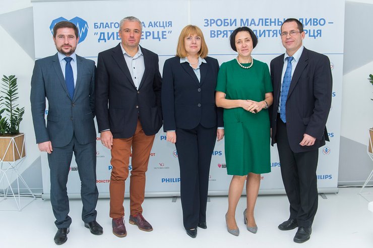 Вячеслав Поврозник, представитель компании Philips Ирина Березовская, дизайнер Виктория Гресь и главный врач Центра детской кардиологии и кардиохиругрии Владимир Жовнир