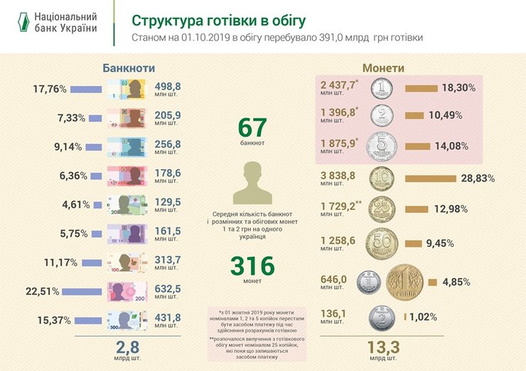 Отмечается, что всего в обращении по состоянию на 1 октября было около 5,7 миллиарда штук таких монет. А всего в обороте на первое число текущего месяца находилась наличность на общую сумму 391 миллиард гривен, в том числе 2,8 миллиарда штук банкнот на 388,4 миллиарда гривен и 13,3 миллиарда штук монет на 2,5 миллиарда гривен.