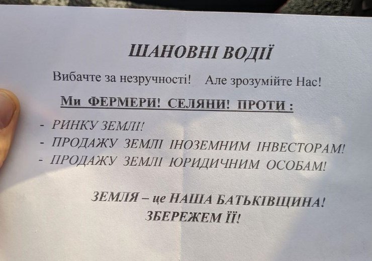 По Украине проходят ранее анонсированные акции, участники которых протестуют против возможной отмены моратория на рынок земли. Аграрии беспрерывно ходили по пешеходным переходам, препятствуя транспорту и перекрывая дороги по лозунгом "Нет распродаже Украины!".