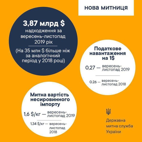 За сентябрь-ноябрь поступления от таможни в госбюджет в долларовом эквиваленте составили $3,87 млрд - на 1% больше, чем за аналогичный период 2018-го. При этом стоимостные объемы налогооблагаемого импорта уменьшились на 7% (в первую очередь из-за падения мировых цен на уголь, газ, нефть). То есть, при уменьшении стоимости ввозимых товаров таможня собирает больше платежей.