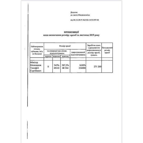 Премию предложено начислить за три прошедших месяца совокупно в размере 1630% или 236 тыс. грн. Таким образом, заработная плата министра в ноябре может составить 271 тыс. грн.