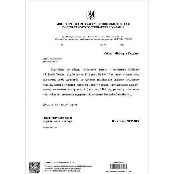 Исполняющий обязанности госсекретаря Минэкономики Александр Черных попросил Кабмин утвердить начисление премии министру Тимофею Милованову в ноябре. Об этом сообщает ZN.UA.