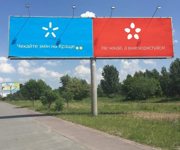 Украинские рекламисты тоже любят подшутить над конкурентами. Например, несколько лет назад мобильный оператор "Киевстар" к запуску 3G-связи разместил наружную рекламу со слоганом: "Жди изменений к лучшему". Их конкуренты из МТС отреагировали тут же, разместив рядом билборды с призывом: "Не ждать, а уже пользоваться".
