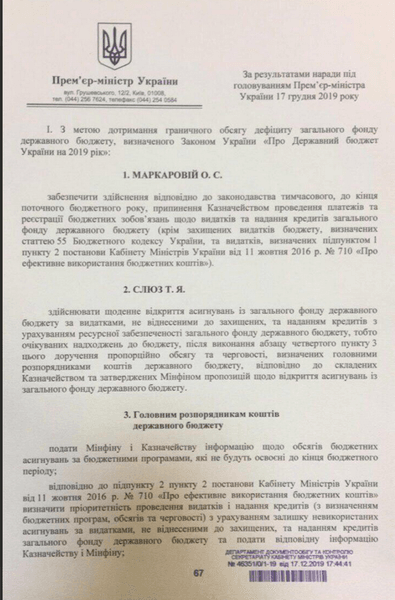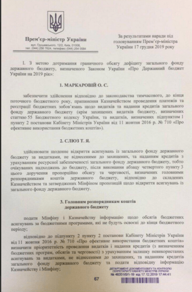Премьер-министр Алексей Гончарук поручил Минфину до конца текущего бюджетного года остановить проведение Госказначейством платежей и регистрации бюджетных обязательств по расходам. Об этом сообщил Интерфакс-Украина.