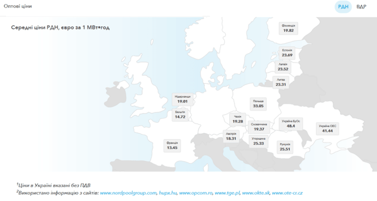 Стоимость электроэнергии для бизнеса на рынке на сутки вперед (РСН) в Украине значительно выше, чем на биржах у европейских соседей
