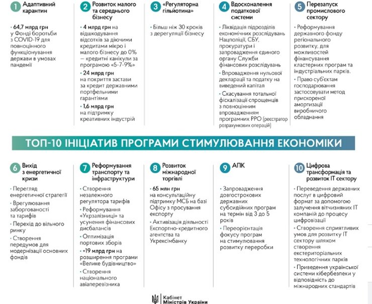 Премьер министр Денис Шмыгаль обнародовал подробности программы по стимулированию экономики после кризиса, вызванного пандемией коронавируса. Об этом он написал в Facebook.
