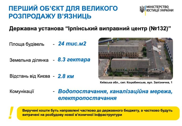 На странице Минюста уже выставлен на продажу ГУ "Ирпенский исправительный центр (№ 132)", который расположен в центре пгт Коцюбинское в 14 км от Киева. В связи с продажей министр Малюська даже снялся в рекламном ролике: