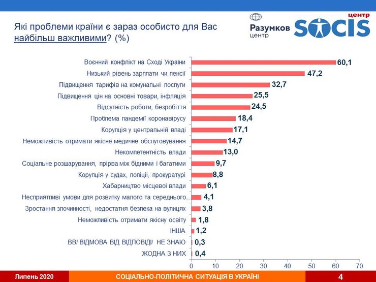Самыми наболевшими проблемами для граждан, по данным опроса, оказались: конфликт на Донбассе (60,7%), низкие зарплаты и пенсии (47,2%), а также повышение тарифов на коммунальные услуги (32,7%).
