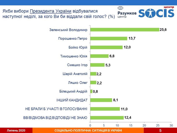 При этом, по данным исследования, большинство украинцев – 25,6% – проголосовали бы за Зеленского, если бы выборы происходили на следующей неделе. Его конкуренты Перт Порошенко и Юрий Бойко набрали бы 13,7% и 12,0% соответственно: