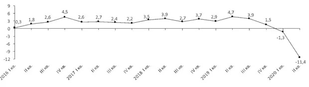 В первом квартале этого года экономика Украины сократилась на 1,3%, во втором – на 11,4%, в целом в первом полугодии спад составил 6,4% после роста на 3,2% по итогам 2019 года.