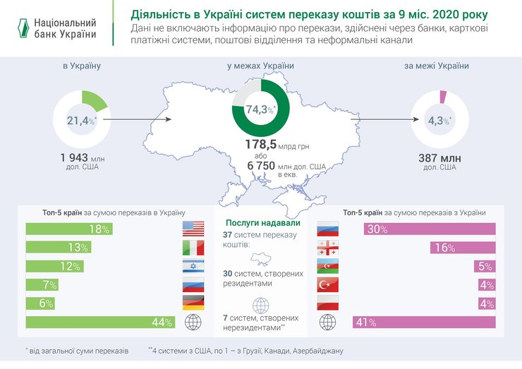 В то же время из Украины за границу перевели 575 млн долларов. Больше всего переводов было отправлено в РФ, Грузию, Азербайджан, Турцию и Польшу.