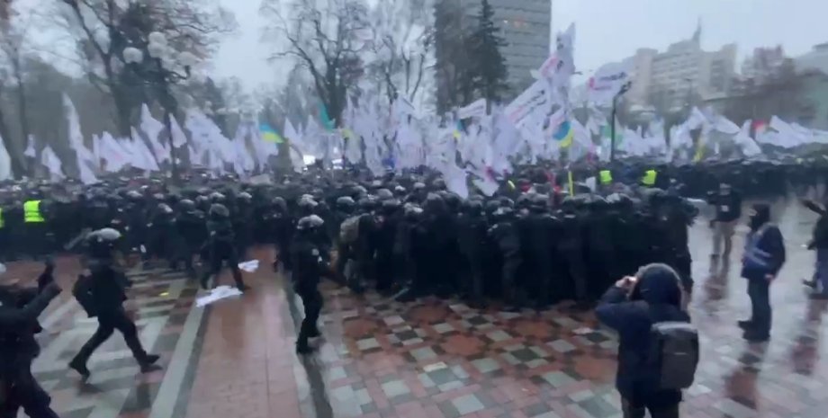 После провала голосования за законопроект об отсрочке введения кассовых аппаратов (PRO) предприниматели, митинговавшие под Верховной Радой, начали прорываться в здание парламента, сообщает "Страна".