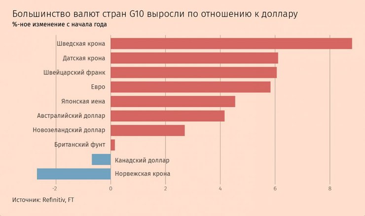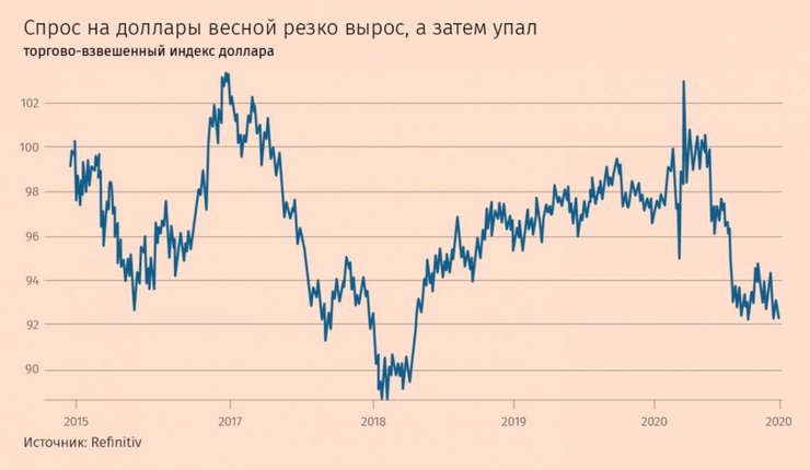 Как отмечается в материале, индекс доллара – то есть стоимость американской валюты по сравнению с шестью основными мировыми аналогами – уже снизился в этом году, упав более чем на 4% с начала 2020-го, после того как Федеральная резервная система США отменила некоторые опции доходности, которыми американские активы обладали по сравнению со своими аналогами.