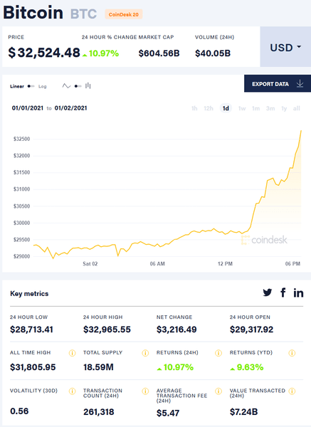 Максимальная стоимость 2 января достигла 32,965.55 долларов, сообщается на сайте Coindesk.