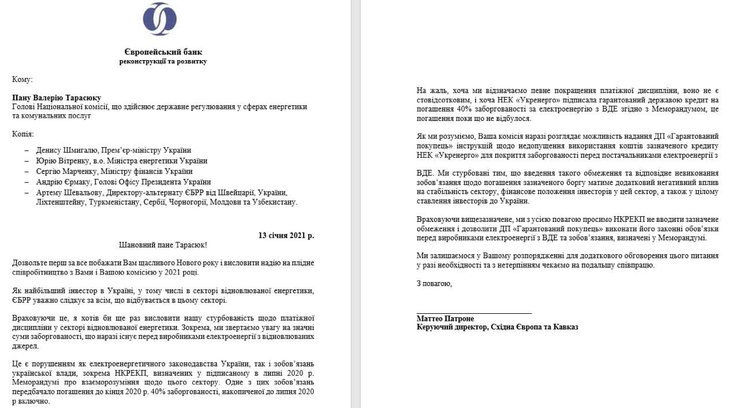"Это является нарушением как электроэнергетического законодательства Украины, так и обязательств украинской власти, в частности НКРЭКУ, определенных в подписанном в июле 2020 г. меморандуме о взаимопонимании относительно этого сектора. Одно из этих обязательств предусматривало погашение до конца 2020 г. 40% задолженности, накопленной до июля 2020 г. включительно… И хотя НЭК "Укрэнерго" подписала гарантированный государством кредит на погашения 40% задолженности за электроэнергию из ВИЭ в соответствии с меморандумом, это погашение пока не произошло", — написано в письме.