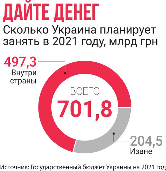 На фоне сокращения ВВП Украины, которое, по оценкам Минэкономики, за 11 месяцев 2020-го составило 4,7%, соотношение госдолга к ВВП достигло 64%, тогда как для финансовой безопасности государства этот показатель не должен превышать 60%.