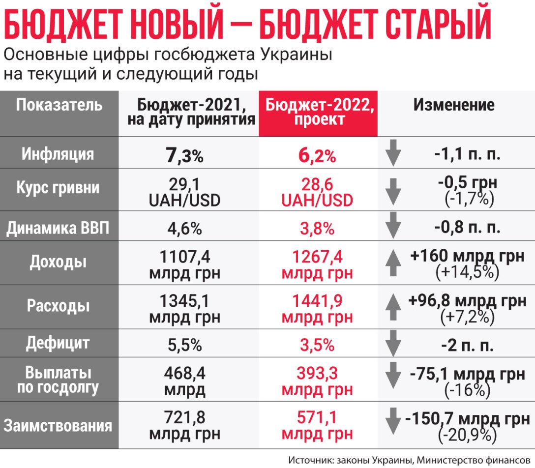 Бюджет на 2022 год составлен с меньшим, чем в предыдущие два года, дефицитом — 3,5% ВВП. По словам Евгении Ахтырко, аналитика инвесткомпании Concorde Capital, это соответствует рекомендациям МВФ и означает, что правительство пытается сверстать реалистичный бюджет, который вызовет как можно меньше замечаний со стороны МВФ в переговорном процессе о выделении кредитных средств.