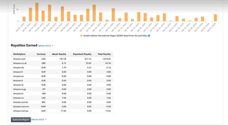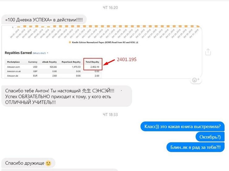 Конечно, это — прорывы после нескольких месяцев работы, в которые 1 книга приносит по 100—150 $. И ежемесячная ваша прибыль зависит от количества книг, которые вы уже опубликовали — раз и навсегда. В среднем хорошие издатели выходят на 1 000 $ в месяц через полгода—год при систематическом подходе. Дальше по нарастающей, и у них уже есть 2 000—3 000 $ каждый месяц при тех же трудо- и времязатратах.
