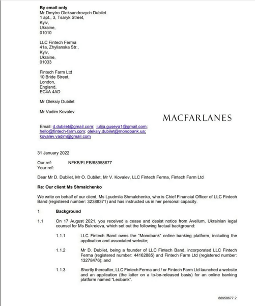 Стало известно, что Дмитрий Дубилет и его компании ООО "Финтех Ферма" (Украина), Fintech Farm (Лондон) получили официальное уведомление от британских адвокатов ООО "Fintech Band" (владельца "Монобанка") о подозрении в хищении интеллектуальной собственности. Об этом сообщают Украинские Новости.