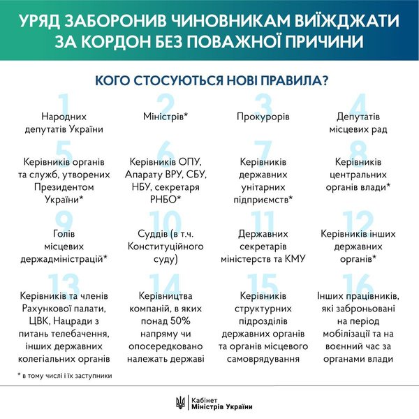 Полный список должностных лиц, о которых упомянули в этом документе, Фокус приводит в своем недавнем обзоре "Римские каникулы отменяются. Почему украинским чиновникам запретили выезд за границу". Следующим шагом для внедрения ограничения должно было стать внесение изменений в "Правила пересечения государственной границы гражданами Украины" от 27 января 1995 года №57, что, собственно, и выполнил Кабмин в пятидневный срок.