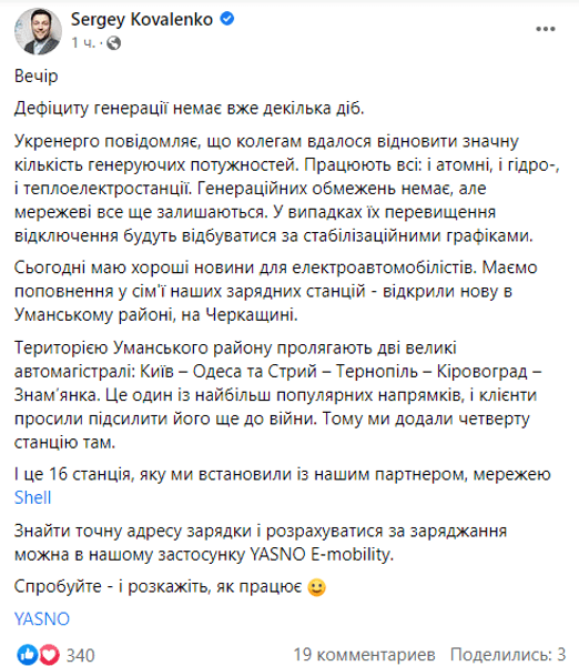 "Укрэнерго" удалось восстановить значительное количество генерирующих мощностей в стране. Об этом в среду, 15 февраля, рассказал гендиректор YASNO Сергей Коваленко на своей Facebook-странице.