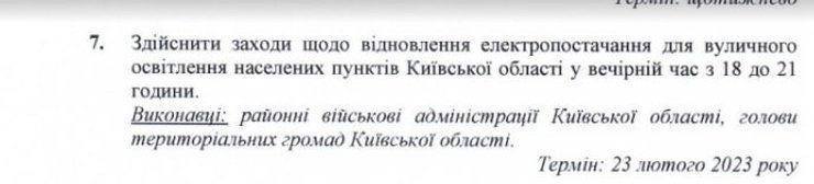 В Киевской области областная государственная администрация издала распоряжение, в котором указано (п.7) осуществление мероприятий по восстановлению уличного освещения населенных пунктов Киевской области в вечернее время. Работы по возобновлению начались вчера, 19 февраля.