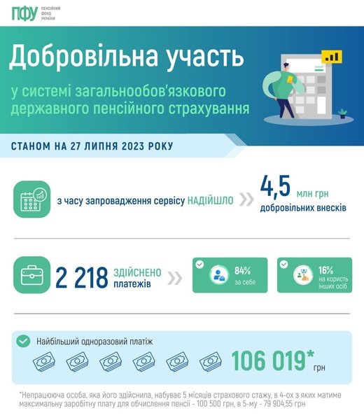 По информации Пенсионного фонда Украины, самый большой единовременный платеж составил 106 тысячи гривен. Человек, который внес такую сумму денег, получил пять месяцев страхового стажа.