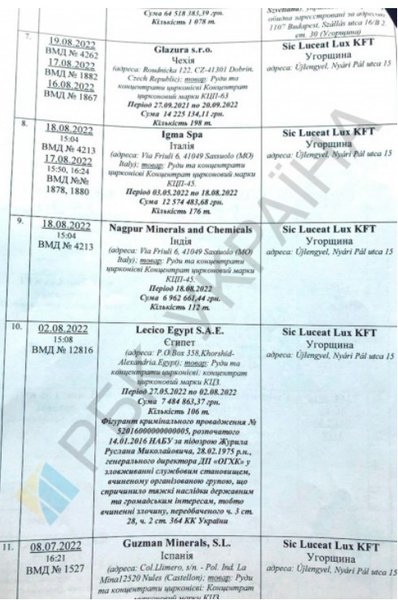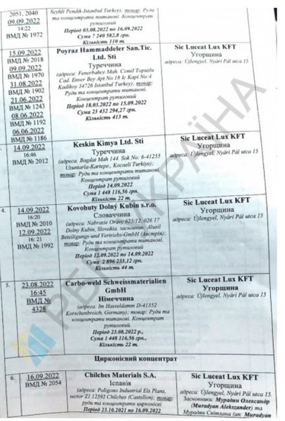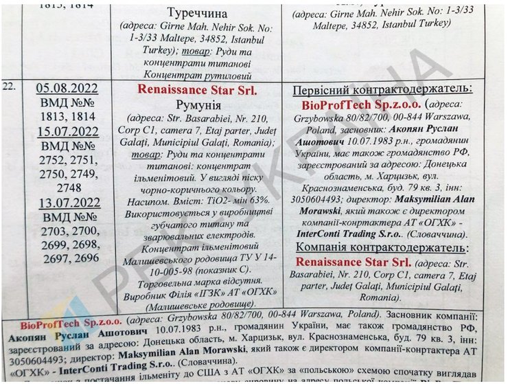 В статье "РБК-Украина" журналисты сообщали, что украинские госпредприятия продают титановую продукцию фирмам-посредникам, учредителями которых являются россияне. Конечным потребителем якобы были военные заводы РФ. Они сделали вывод, что Объединенная горно-химическая компания, принадлежащая государству, отправила на экспорт 82,2 тысячи тонн руд, содержащих титан. Также речь шла об участии компаний-посредников из Польши, Венгрии, Чехии, Словакии, учредителями которых являются граждане РФ, работающие с Россией.