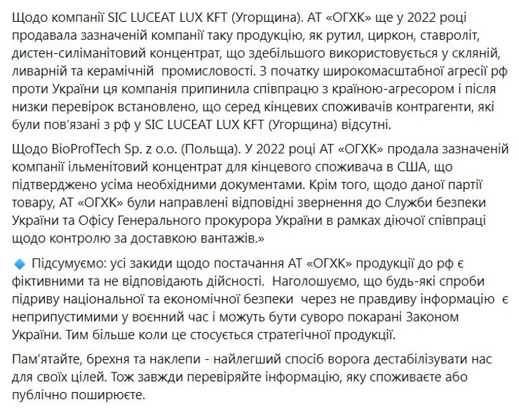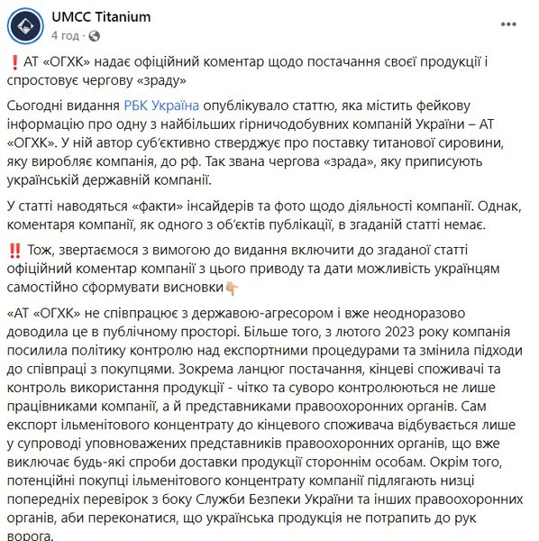Статья о том, что Украина реализует титан для военной техники и вооружения России — неправдивая, а АО "Объединенная горно-химическая компания" (АО ОГХК или UMCC Titanium) никаким образом не сотрудничает с государством-агрессором. Об этом говорится в официальном заявлении UMCC Titanium в Facebook.
